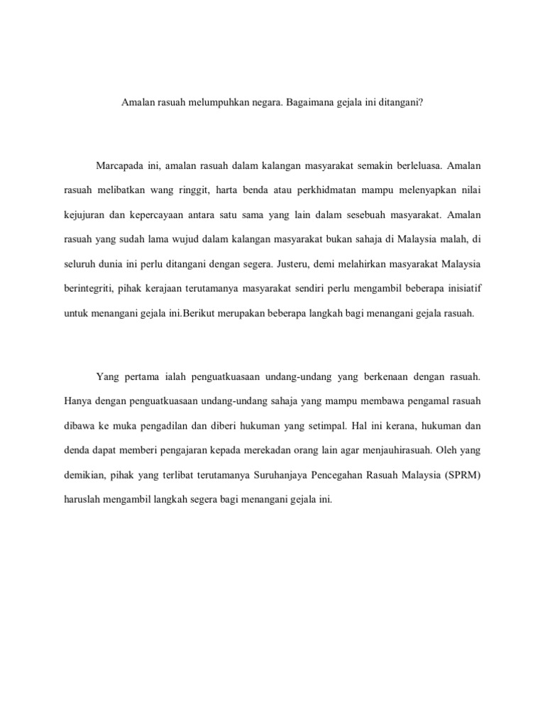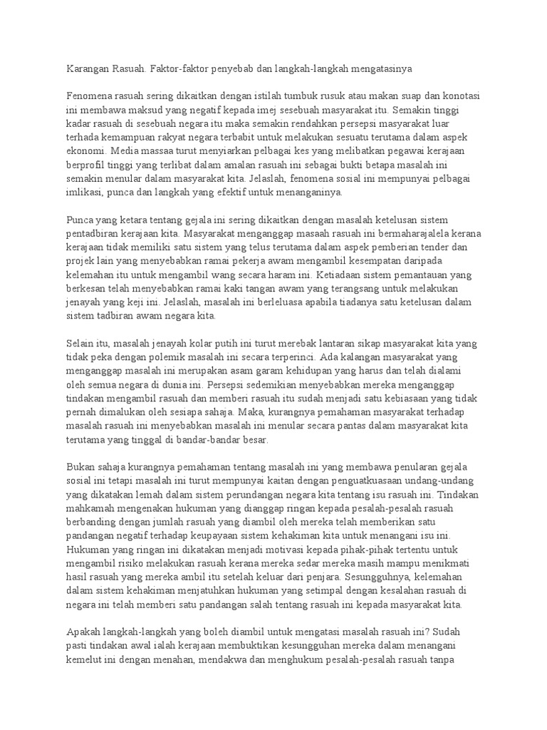 Sesungguhnya tindakan tegas kerajaan mendakwa semua pihak yang terlibat tanpa memilih bulu akan memberi petanda bahawa pengamal rasuah akan menerima hukuman yang setimpal dan menakutkan mereka untuk melakukan jenayah ini. Para pelajar boleh merujuk isi dan cara penghuraian yang dikongsikan dan menafsirkannya dalam bentuk penulisan karangan masing-masing. 4 cadangan PAS untuk tangani rasuah.